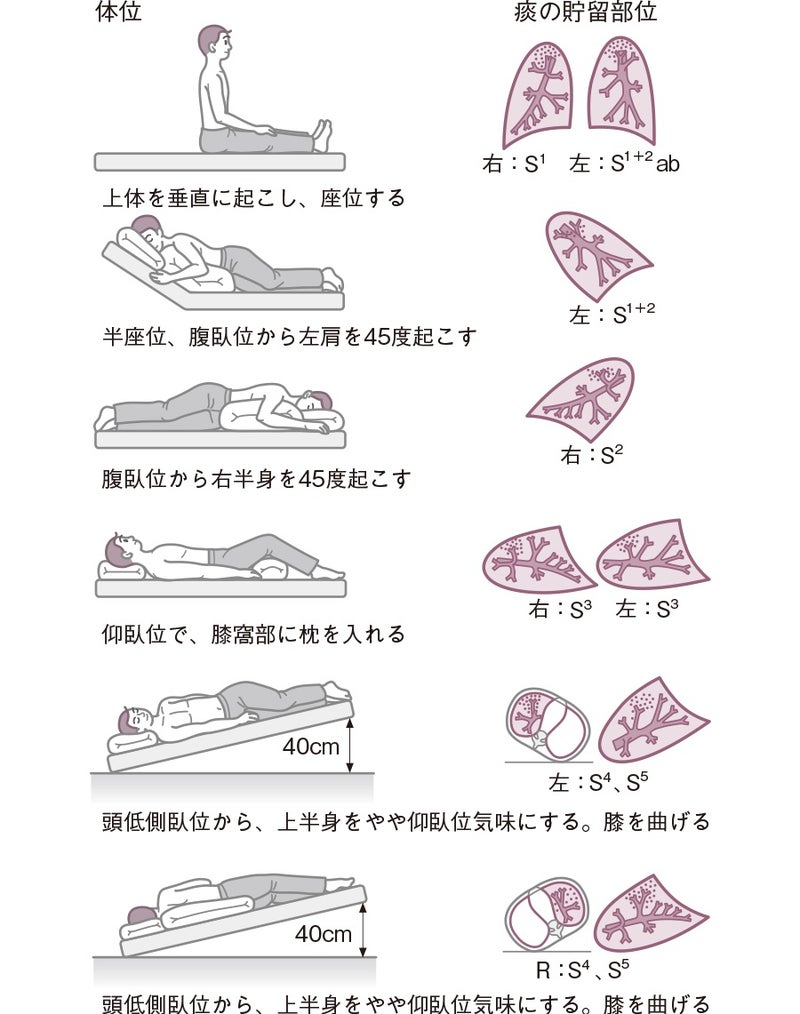 排痰法は肺内の分泌物等を強制的に排出するための手法です。したがって、先ず貯留靴が肺のどの部分にあるかを見極めてから、貯留物を排出し易い、重力を利用した姿勢や体位を取らせます。次に、①スクウィージング ②ハフィング ③タッピング ④バイブレーションなどの手技で排痰を介助する。