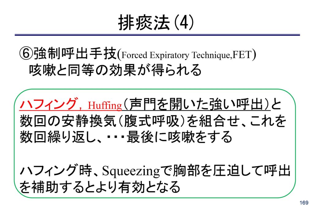 ハフィング時、呼出のタイミングに合わせてスクイージングすると排痰に有効である。