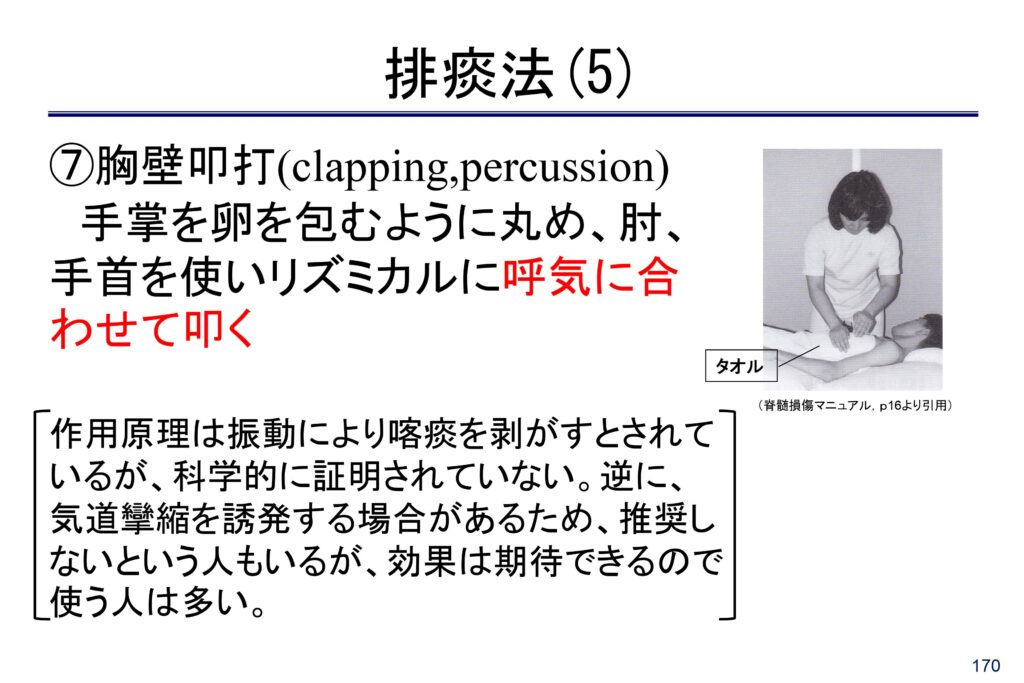 ①スクイージング等、他の手技にも共通するが、聴診器で痰の貯留箇所を見極める。                                            ②重力の利用を考慮して、痰の流動に効果的な姿勢を取る。とくに、背臥位姿勢の長い人には側臥位や腹臥位を試すべきである。                                                ③叩打する前に、リラクゼーション、マッサージおよび肩甲骨、肩回り、脊柱の可動域を拡大することも有効に働く。                                ④叩打は、必ず呼息に合わせて一定のリズムで行う。叩打する手掌の形は指を閉じて丸める形をとる。
